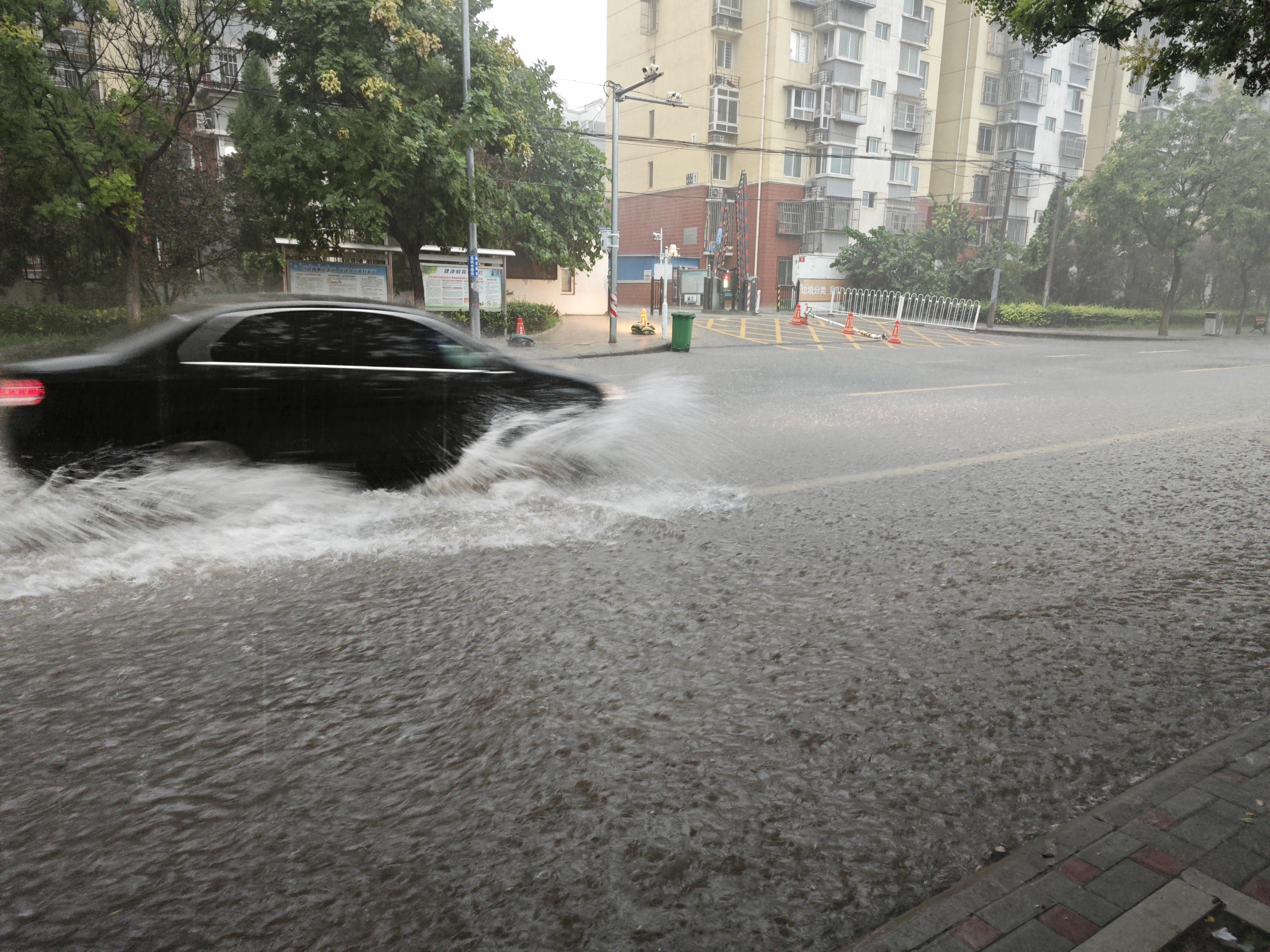 短时候降水后罗奇营路积水已没过脚踝,车辆交游时溅起大片水花。